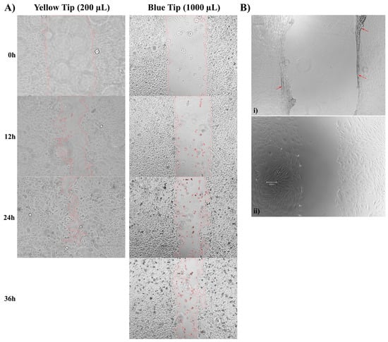 Scratch width and seeding density plays a major role in creating consistent and reproducible scratches. (A) Representative wound outline images of HEKa cells scratched with yellow pipette tips or blue pipette tips, over a 36 hr period. Yellow tip images were taken at 10× magnification; blue tip images were taken at 4× magnification. (B) Representative images of scratches created in primary dermal fibroblasts at different seeding densities; (i) 60,000 cells seeded in a single well of a 24-well plate, (ii) 10,000 cells seeded in a single well of a 24-well plate. All cells were allowed to incubate for 3 days before scratching. Red arrows are highlighting cell sheet layer folding over itself. Images were taken at 4× magnification.