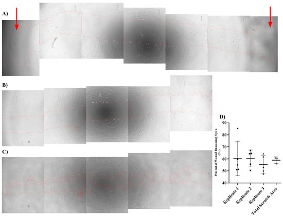 Images were taken using an Evos M5000 (Thermo Fisher Scientific, Waltham, MA, USA) inverted microscope at 4× and 10× magnifications. Images were analyzed using an ImageJ macro developed in our laboratory (Supplementary Materials), which is specifically designed to measure scratch area, subtract any cells that may have migrated into the scratched area, and output the final scratch area in pixels. The ImageJ measurement tool was used to measure the scratch widths with measurements taken at the center of the scratch in each picture, from wall to wall. The percentage of the wound (i.e., scratched area) that remained open was obtained by dividing the scratch area at 12 h, 24 h, and 36 h time points by the scratch area at 0 h time point.