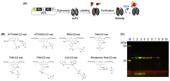 (A) Scheme for the construction of anti-DCA Q-body. (B) Chemical structure of the dyes for generating Q-body. (C) Fluorescence image of SDS-PAGE for Q-bodies. The estimated molecular weight of scFv, including tags was 28.2 kDa. M indicates a protein marker. 1, 2, 3, 4, 5, 6, 7, 8, 9, and 10 indicate the ATTO495-C2-mal-, ATTO520-C2-mal-, R6G-C5-mal-, TAMRA-C0-mal-, TAMRA-C2-mal-, TAMRA-C5-mal-, Cy3-C2-mal-, Rho-C2-mal-, Cy5-C2-mal-, and ATTO655-Cx-mal-labeled Q-bodies, respectively.