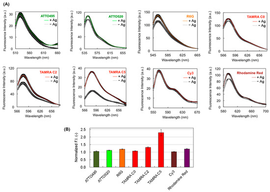 First, 10 ng of Q-body in 250 μL of PBST was added in a 5 × 5 mm quartz cell (Starna Scientific, Hainault, UK), and a high concentration of DCA (3 μM) in PBST (2.5 μL of 300 μM DCA in PBST) was added and mixed with the Q-body solution. Three minutes after adding the antigen, the spectral measurement was performed at RT using the fluorescence spectrophotometer Model FP-8500 (JASCO, Tokyo, Japan). Both the excitation and emission slit widths were set to 5.0 nm. The excitation wavelength was 495, 520, 530, 546, 546, 546, 535, and 565 nm for the ATTO495-C2-mal-, ATTO520-C2-mal-, R6G-C5-mal-, TAMRA-C0-mal-, TAMRA-C2-mal-, TAMRA-C5-mal-, Cy3-C2-mal-, and Rho-C2-mal-labeled Q-body, respectively.
