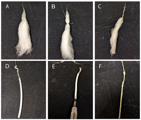 Figure 1. Cotton fiber preparation for embedding. (A) Cotton fiber bundle; (B,C) the cotton fiber bundle is wrapped with galvanized wire; (D) cotton fiber bundle in Teflon tubing; (E) injecting the polymerization solution; (F) polymerized cotton fiber bundle. - Loop 24-gauge galvanized wire around 3 inches of the bundle, leaving excess wire facing away from it. Tightly wrap ~1/3 of the bundle with the wire (Figure 1B,C).