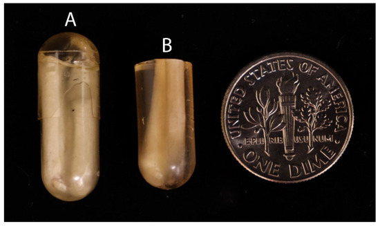 Figure 2. Embedded capsule preparation. (A) Polymerized resin with embedded fiber in capsule; (B) cut capsule section of embedded fiber. (US dime for scale.) - Polymerization should take 5–10 min and should not release excessive heat. Remove the gel capsules using a single-edged razor by cutting between the gel capsule and resin (Figure 2B).