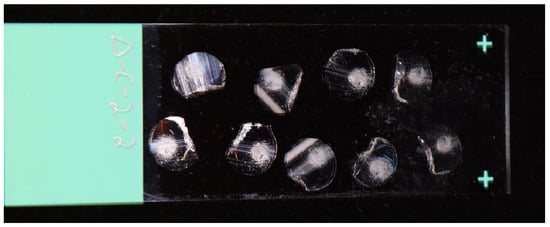 The quality of microtome sections is highly dependent on the condition of the glass blade used for sectioning. Any defects or nicks on the blade can cause a “dragging” appearance in the section, which is indicative of tearing rather than a clean cut. Therefore, to avoid issues with sectioning, it is recommended to use a fresh glass knife and to replace it regularly throughout the sectioning process. Figure 3 provides an example of well-cut sections, where most of the section is clear, with occasional lines being acceptable and not significantly affecting imaging or data acquisition. It is not uncommon for some sections to fold over themselves. The degree of polymerization of the resin is a crucial factor to consider, as over-polymerization can lead to the rapid dulling of the blade, as opposed to properly polymerized resin. The number of required fibers for imaging will determine the number of sections that can be added to a single microscope slide. After the drying process, some sections may loosen and fail to lie flat on the slide. In such instances, re-wetting the slide and allowing it to dry again can facilitate adhesion of the sections to the slide. To improve imaging outcomes, the use of positively charged slides is suggested, as they enhance section adhesion and facilitate flatness.