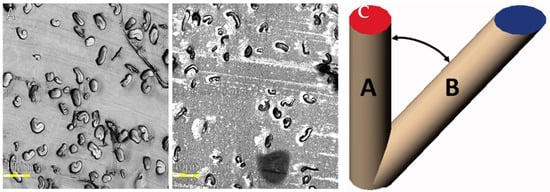 An example of contrasting section quality is shown in Figure 4A,B below. Additionally, the degree of polymerization of the resin is a crucial factor since over-polymerization can lead to the blade rapidly dulling. Over-polymerization also leads to excess heat release during the polymerization process. Excess heat can lead to morphological changes in the fiber that will not revert to the original shape due to the surrounding polymerization. The embedding technique is critical, as fibers should be as perfectly close to the fiber axis as possible for precision with measurements. Deviations from the normal fiber axis will influence the actual observable surface area as the plane changes, as shown in Figure 4C.