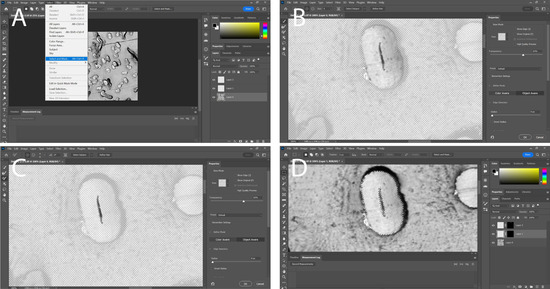 - To create a mask on the original layer of the image, highlight both the upper surface of the crystalline structure and the lumen. Generate a new mask by selecting “Select” followed by “Select and Mask” (Figure 6A). Use one of the brush tools to highlight the fiber (Figure 6B) or the lumen (Figure 6C) entirely. This will generate a mask that represents what was highlighted.