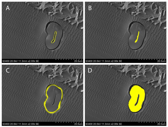 Measurements of interest shown in yellow. (A) The lumen circumference; (B) lumen area; (C) fiber circumference; (D) fiber area.