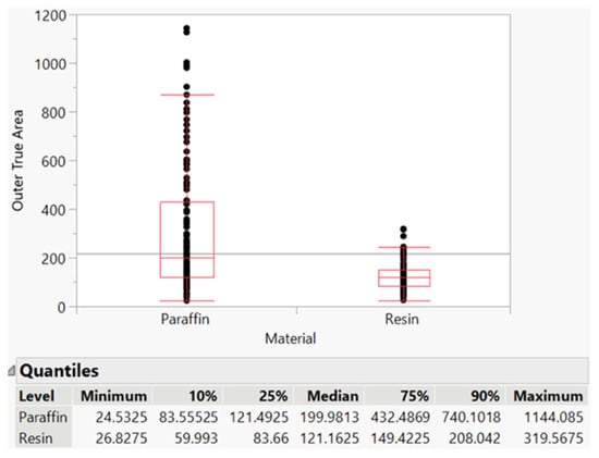 As previously stated, there was a switch from paraffin to resin, as it allowed for easier, more efficient, and more controlled isolation of cotton fibers. Figure 8 shows the distribution differences between paraffin and resin, with paraffin having a larger range of values (see the maximum of paraffin vs. maximum of resin), which could be attributed to error introduced by the embedding method.