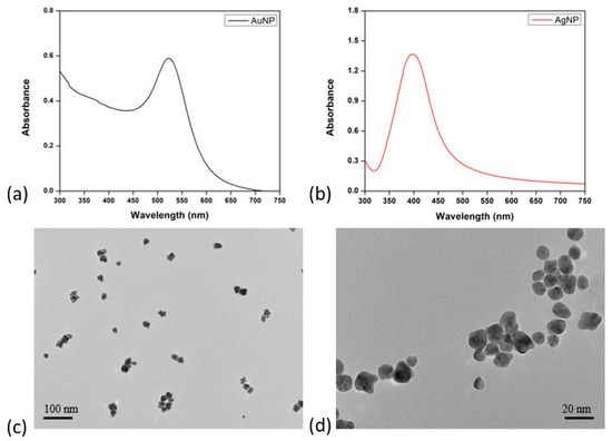 Characterisation of gold and silver nanoparticles. (a) The UV-visible spectra of AuNPs, (b) the UV-visible spectra of AgNPs, (c) a TEM image of AuNPs, and (d) a TEM image of AgNPs.