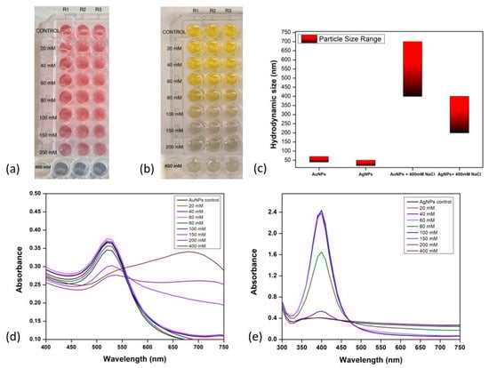 Gold and silver nanoparticles aggregation behaviour in differing alkaline environments. (a) Image of AuNP with series of NaCl solution in the 96 well plate. (b) Image of AgNP with series of NaCl solution in the 96 well plate. (c) Histogram of the hydrodynamic size of AuNPs and AgNPs with and without 400 mM NaCl. (d) The spectra of AuNPs under different concentrations of NaCl. (e) The spectra of AgNPs under different concentrations of NaCl.