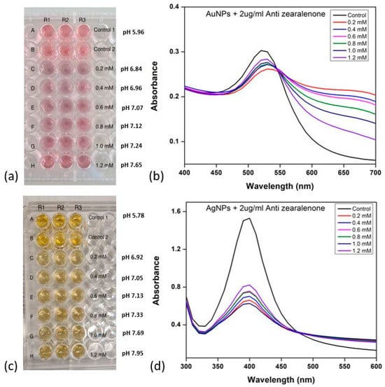 Gold and silver nanoparticle aggregation behaviour in differing alkaline environments. (a) Image of AuNP with the series anti-zearalenone solution in the 96-well plate. (b) The spectra of AuNP at varied anti-zearalenone concentrations. (c) Image of AgNP with the series anti-zearalenone solution in the 96-well plate. (d) The spectra of AgNP at varied anti-zearalenone concentrations.