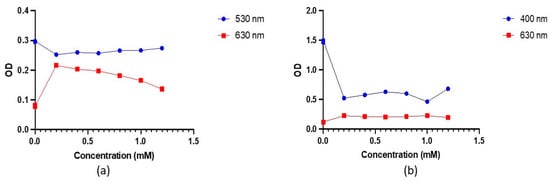 Optical density (OD) of AuNPs and AgNPs at varying K2CO3 concentrations. (a) OD of AuNP was taken at 530 nm and 630 nm. OD decreases at 520 nm and increases at 630 nm. (b) Optical density (OD) of AgNP at K2CO3 concentrations. Note: 0 mM (control at K2CO3 concentrations 0.2 mM, 0.4 mM, 0.6 mM, 0.8 mM, 1.0 mM, and 1.2 mM.