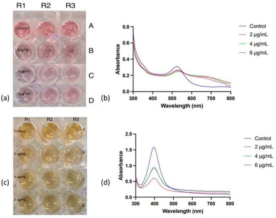 Colourimetric assay of AuNPs at varying antibody concentrations in an alkaline environment. (a) Row A is the control, which contains AuNPs, DI water, and antibodies. In rows B–D, the concentration of NaCl and K2CO3 was kept constant at 200/150 mM and 1.2 mM, respectively. The varying antibody concentrations were 2 and 4 µg/mL. R1, R2, and R3 are replicates. (b) A UV-visible spectrum of AuNPs and various concentrations of anti-zearalenone antibody conjugates. (c) Row A is the control, which contains AgNPs, DI water, and antibodies. In rows B–D, the concentration of NaCl and K2CO3 was kept constant at 200/150 mM and 1.2 mM, respectively. The varying antibody concentrations were 2, 4, and 6 µg/mL. R1, R2, and R3 are replicates. (d) A UV-visible spectrum of AgNPs and various concentrations of anti-zearalenone antibody conjugates.
