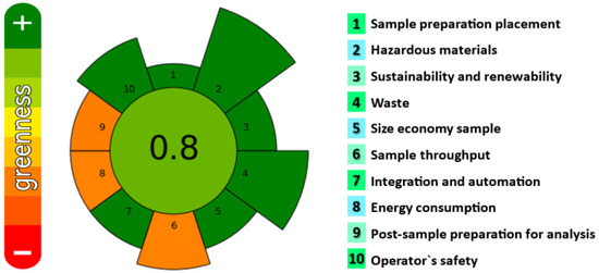 In recent years, the development of extraction methodologies fulfilling green analytical chemistry (GAC) and green sample preparation (GSP) principles is increasing. These procedures include the use of safe solvents, reagents and materials minimising the experimental steps and reducing waste generation and energy consumption, allowing high sample throughput. In 2022, a metric tool, AGREEprep [19] was proposed for assessing the greenness of the sample preparation stage of an analytical procedure. The metric is based on ten principles of GSP, assigning weights at each criteria, depending on its significance in the analytical method. These weights range from 1, indicating low importance, to 5, representing high importance. Once the ten principles are evaluated, the tool is recalculated to the 0–1 scale to reflect the sample preparation greenness. The colour of the inner circle also provides the overall sample preparation greenness performance.