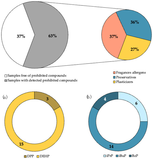 Percentage of banned compounds in the analysed samples and distribution by families: (a) phthalates and (b) parabens.