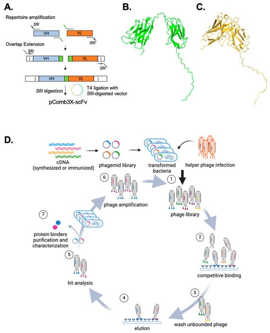 Workflow of scFv library generation and phage display affinity selection. (A) Repertoire amplification: variable heavy (VH) and variable light (VL) regions (including both κ and λ chains) are PCR-amplified from the cDNA of human peripheral blood mononuclear cells (PBMCs) using primers containing SfiI restriction sites (indicated by dots). During amplification, short or long overlapping linker sequences (highlighted in green) are introduced upstream of VH and downstream of VL. Overlap extension: a subsequent PCR promotes the annealing of VH to VL with either short or long linkers, resulting in the formation of scFv constructs. These constructs are digested with SfiI and ligated into the SfiI-linearized pComb3XSS vector, creating the scFv phagemid library for subsequent phage display affinity selection toward specific antigens. (B,C) Structural predictions of scFvs: AlphaFold-predicted structures of scFvs with a short linker (VH–S–VL) (B) and a long linker (VH–L–VL) (C). The VH-S-VL is predisposed to form bispecific diabodies, whereas the VH–L–VL likely maintains a structure akin to the natural antibody paratope. (D) Phage display affinity selection procedure: the scFv phagemid library is introduced into F-pilus-bearing bacteria and subsequently infected with helper phages, resulting in the production of phages that display scFvs. These phages are then subjected to successive rounds of screening to bind the target antigen, as illustrated in steps 1–6. Typically, three to five rounds of affinity selection are necessary to isolate scFvs that bind with high affinity to the target antigen.