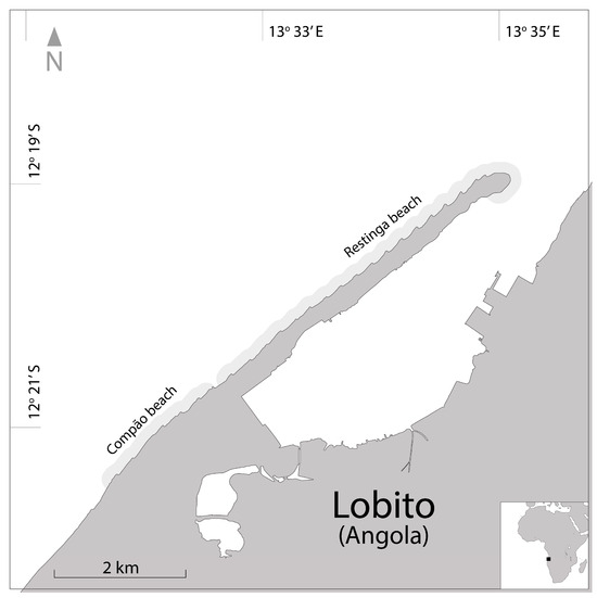 Restinga and Compão beaches show different geomorphological characteristics. Restinga is a geographic region characterized by elongated sandy deposits (with a length of approximately 4.8 km) that run parallel to the coastline, which are formed through sedimentation processes. Restinga is a semi-enclosed system comprising a bay and the open sea, featuring beaches that extend along its entire length, separated by spurs. Furthermore, it comprises urban, tourist, and industrial areas, as well as a port. The beaches of Compão feature extensive sandy areas that are located within the coastal zone of the city, which is an urban area under significant anthropogenic pressure due to the presence of many fishermen who perform continuous net fishing activities on these same beaches throughout the day. The sand of these beaches is of the siliceous type with a yellow color. The vegetation is scarce, and when present, it is found in the upper zone of the beach.