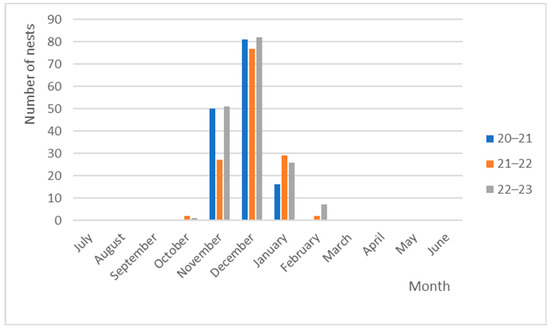 By examining the quantities of nests and their corresponding dates, it is evident that December showed the highest frequency of nesting among the three seasons investigated, with a noteworthy total of 240 documented nests. In contrast, the month of October exhibited the lowest occurrence rate, with a mere three nests observed throughout the three seasons under analysis. In 20–21, no nests were documented, while 21–22 saw two nests, and 22–23 recorded a sole nest (Figure 2).