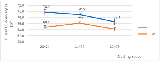 Average CCL and CCW of nesting females (n = 200) during each nesting season with tendency lines.