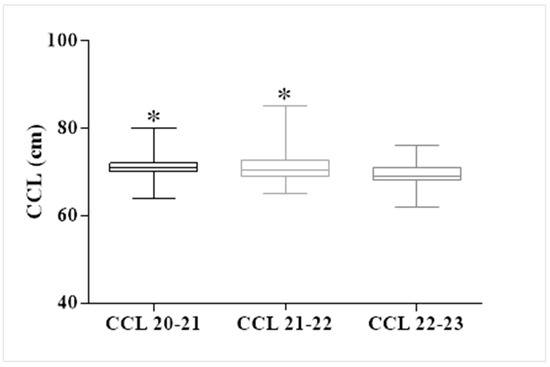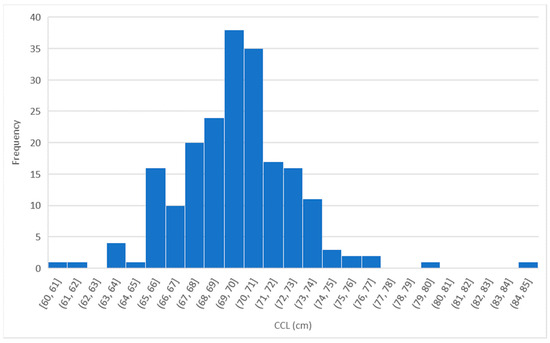 Through the analysis of Figure 4, it is possible to observe that the most represented CCL values were within the range of 69–70 cm.