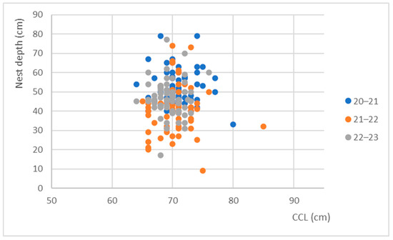 The data collected during the 20–21 season indicate that the nesting depth was significantly deeper, with an average of 51.5 cm, and it exhibited a smaller and deeper range of values (ranging from 23 cm to 79 cm) in comparison to the nesting depths found in following seasons. By analyzing Figure 7, it is possible to observe a shift in the cluster for each season with respect to the nest depth.