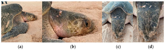 Example of photographs from a nesting female for individual analysis and identification: (a) right lateral view, (b) zoomed-in right lateral view, (c) top view of the head, and (d) zoomed-in top view of the head.