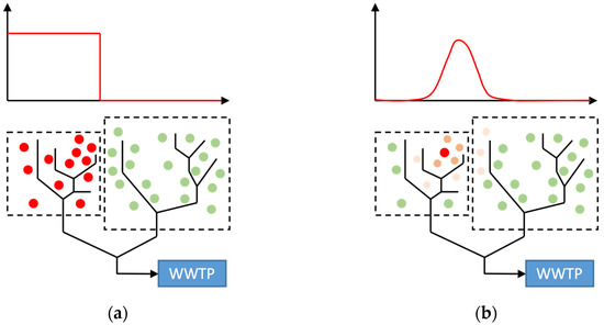 - The probability distribution function is simply based on the assumption that all infected people come from the same sub-catchment. For a better representation, epidemiological data could be used to estimate real infection distributions, as shown in Figure 5b.