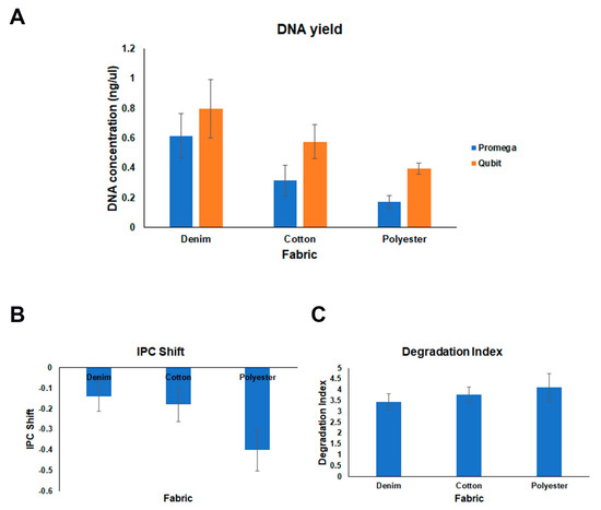 Figure 2A shows the concentrations obtained per fabric with both Qubit and PowerQuant. As expected, human-specific quantification was lower than fluorescent quantification. Despite this, human-specific quantification obtained per fabric was enough to perform the next step, the amplification of the STRs through PCR using 1 ng of the sample. Figure 2B depicts the results of the PowerQuant regarding the presence of inhibitors, with the parameter called IPC shift. As the graph shows, the values were negative; thus, no inhibitors were detected in the samples, even among the different types of fabrics. Figure 2C shows the assessment of DNA degradation, through the Degradation Index (DI). The values were between 3 and 4, indicating no degradation or minimum degradation of the DNA, matching with previous results from our lab.