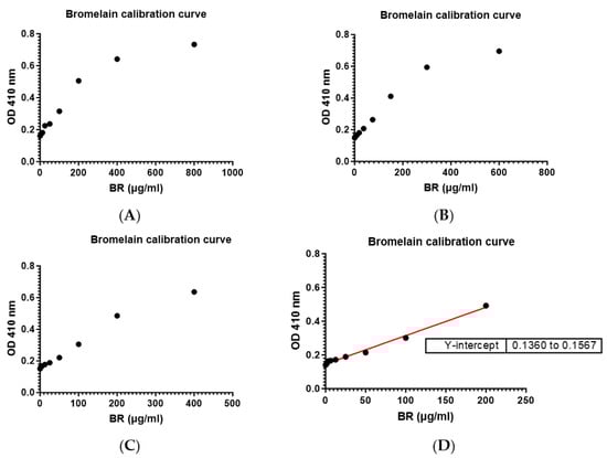 The linear bromelain calibration curve was generated using different concentrations of Bromelain (i.e., serial dilutions of Bromelain at 800 (A); 600 (B); 400 (C); and 200 (D) µg/mL) to demonstrate linearity.