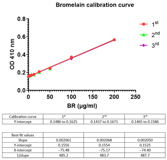 Three series of calibration curves were plotted by serial dilutions (0–200 µg/mL) in dH2O using a stock solution of bromelain. UV absorption was measured in triplicates at 410 nm. The limits of detection (LOD) and the limit of quantification (LOQ) were evaluated directly from the calibration curve, as stipulated by the ICH guidelines [11].