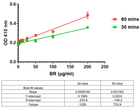 Two bromelain serial dilutions (0–200 µg/mL) were prepared, and the azocasein reactions were stopped at either 30 or 60 min (Figure 3). A comparison of the 1/slopes of the two calibration curves, 30 min vs. 60 min, shows that there is a much better response at 60 min (color as shown by the OD 400 nm).
