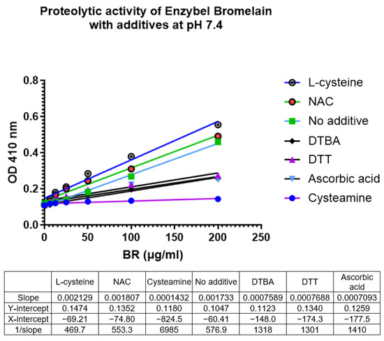 Amongst the various agents added, the proteolytic activity of bromelain with only L-cysteine and NAC was enhanced when compared to bromelain without any antioxidant addition (Figure 5).