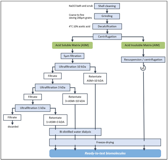 In this paper we present a novel manner of utilizing insoluble matrices extracted from diverse mollusc shells of economic interest. From a theoretical viewpoint, our protocol, based on the complete decalcification of shell powder, allows the extraction of all the organics contained in shells, whatever they are (proteins, polysaccharides) and whatever their state in water or in dilute acid (soluble vs. insoluble). Interestingly, by using different ultrafiltration cutoffs, most of the acetic acid-soluble organic fractions (ASMs) are collected with a minimal loss and can be further analysed. The exception is the fraction inferior to 1 kDa, corresponding to very short peptides (fewer than ten amino acid residues on average) that pass through the 1 kDa ultrafiltration membrane: there is no easy way to concentrate this fraction and separate it from the free inorganic ions resulting from the decalcification, including calcium, carbonate, bicarbonate, and acetate. However, previous research suggests that the fraction below 1 kDa is extremely minor in comparison to the other soluble ones of a molecular mass above 1 kDa [20].