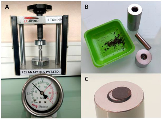 Pelletisation process. (A) Hand-operated tablet press machine, showing a force of 1 ton put onto the AIM to make a tablet (PH-mini, LC-Instru). (B) Freeze-dried AIM extracted from Cerastoderma edule, next to the pellet mould set. (C) Freshly produced AIM pellet of C. edule.