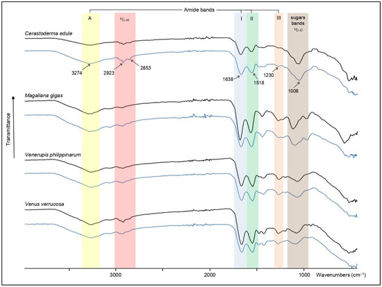 FT-IR spectra of the AIMs of the four tested bivalve shell matrices. The AIMs were monitored in two conditions: before (black curve) and after (blue curve) pelletisation. Note that the pelletisation process did not modify the IR signature of the spectra. A, I, II and III correspond to the different amide absorption bands of proteins.