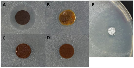 Antibacterial assays of AIM tablets on Aliivibrio salmonicida cultures grown on marine agar. (A) Cerastoderma edule AIM; (B) Magallana gigas AIM; (C) Venerupis philippinarum AIM; (D) Venus verrucosa AIM. (E) positive control with vibrio static agent O.129 (Bio-Rad). While (C,D) give negative signals, (A,B) induce inhibition zones, and show bactericidal ability against A. salmonicida. The positive control shows a large inhibition zone.