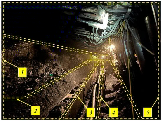 View of a mining wall using a mechanized longwall complex, where its significant areas are marked: (1) coal sidewall, (2) path of the combine shearer, (3) longwall scraper conveyor, (4) crew passage path and (5) powered roof support.