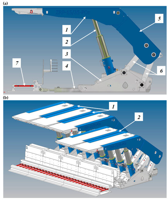 View of the powered roof support in the mining longwall: powered roof support components (a), canopy (1), hydraulic actuator (2), floor base (3), beam of sliding system (4), shield support (5), lemniscate mechanism (6) and longwall scraper conveyor (7); and operation of powered roof support (b), sections of powered roof support expensed in the wall (1) and sections of the powered roof support moved (2).