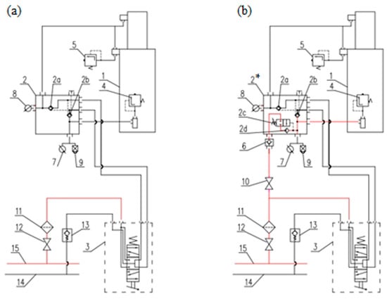 The hydraulic system of a powered roof support prop: (a) traditional and (b) modified, where 1—hydraulic prop; 2—traditional valve block; 2*—double valve block with automatic pressure charging; 2a, 2b and 2d—check valve; 2c—threshold valve; 3—four-way distributor; 4 and 5—safety valve; 7 and 8—manometer; 9—pressure indicator; 10 and 12—shut-off valve; 11—filter; 13—check valve; 14—runoff line; 15—supply line.