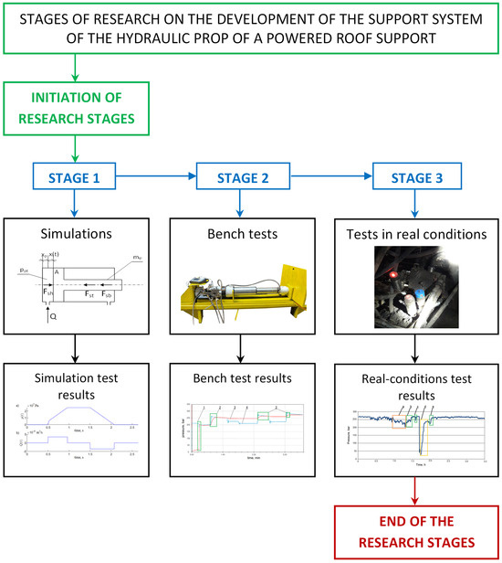 The authors conducted tests to evaluate the operation of the prototype double block with automatic pressure charging. As required by the accepted procedure (Figure 5), the scope of the study included three stages. In the first stage, simulation studies were carried out. They required the development of a mathematical model of the powered roof support. Several simulations were carried out on the model, which made it possible to verify the correctness of the adopted concept for developing a prototype block. In the second stage, the block was subjected to bench testing—the results of the bench tests allowed us to assess the correctness of the block. In the last stage, the third stage, tests were conducted under real conditions. The tests verified the work of the block in the mining wall and its usefulness.