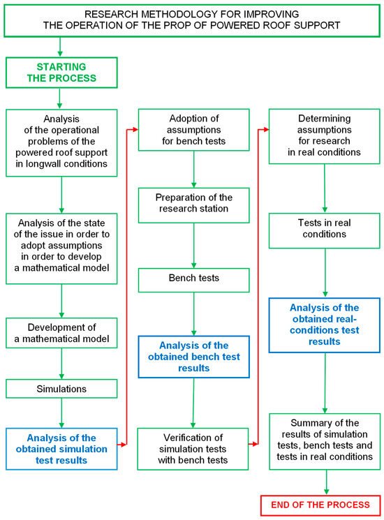 The accepted course of research is presented in Figure 5. The implementation of the research began with an analysis of the operational problems of the powered roof support in longwall conditions. The analysis allowed us to distinguish real problems when using the powered roof support section and the disadvantages of the currently used solutions. This analysis aimed to introduce changes in the support system of the powered roof support’s hydraulic prop. The proposed change was to provide the powered roof support with the required load-carrying capacity. The above was aimed at improving safety in hard coal mines and increasing the efficiency of the mining process.