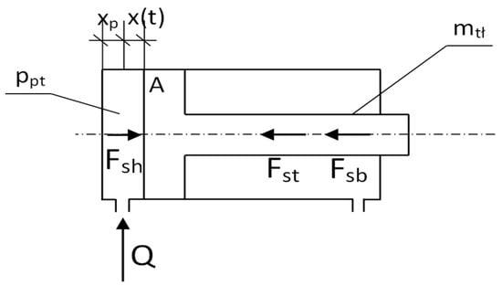 where mtł—the mass of the piston; x—the displacement of the piston; fs—the coefficient of friction; ppt—the pressure in the sub-piston space of the prop in time; A—the surface area of the piston; Q—the flow rate of the liquid that flows into the cylinder; xp—the beginning position of the piston; and B—the bulk modulus of hydraulic fluid.