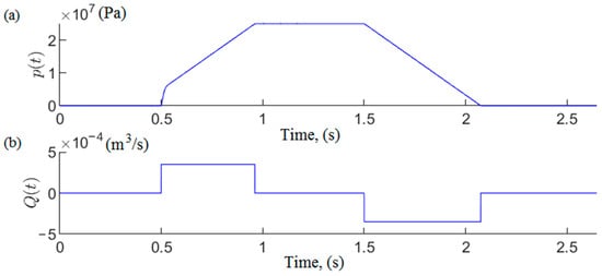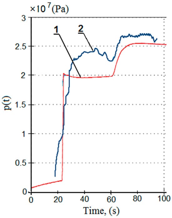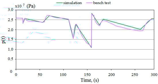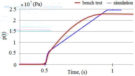 Simulation studies were carried out on the developed model. The MATLAB R2020b software was used for this research [56]. As a result of the computer simulations, temporal pressure changes in the prop’s sub-piston space were obtained. Sample test results are presented in Figure 7.