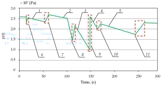 Results of simulation tests for the proposed charging function, where 1, 2, 3, 4, and 5—pressure loss; and 6, 7, 8, 9, 10, and 11—pressure charging area.