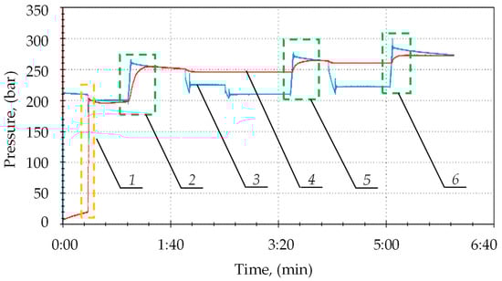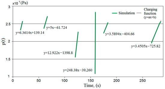 Figure 9 shows the supercharges obtained in simulation tests. These charges were described by a linear function. The slope of the function describes the charging speed. For the fourth charge, a high value of the slope coefficient was obtained, different from the others. In this case, a significant pressure drop was noted under the prop piston. Therefore, there was a significant difference in the pressure values in the sub-piston space of the prop and the supply line, which resulted in a higher liquid flow rate for charging. This could affect the speed of the charging.