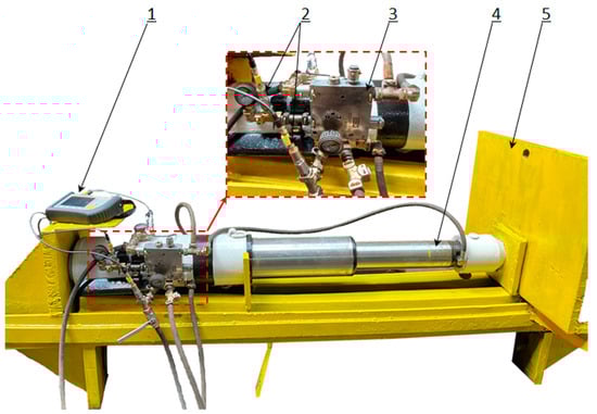 Test site with the tested double block: 1—measuring device; 2—pressure sensors; 3—double block with automatic pressure charging; 4—hydraulic prop; and 5—test site frame.
