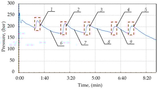 Results of bench tests of the double block operation with charging: 1, 2, 3, 4 and 5—automatic pressure charging area; and 6, 7, 8 and 9—pressure loss in the space under the prop’s piston.