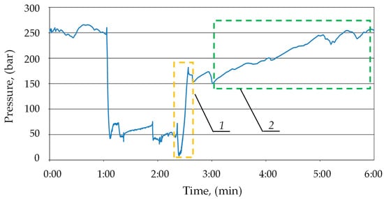 The course of pressure changes in the sub-piston space of a hydraulic stand with internal leakage (blue line) during the expansion operation: 1—expansion of the prop by the operator; and 2—automatic pressure charging.