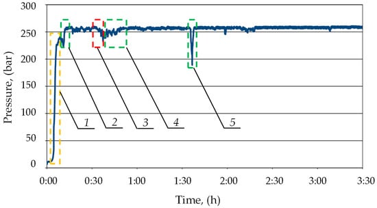 Figure 15 shows the pressure measurement over 3.5 h. As can be seen, after installing the prototype block in the hydraulic system of the leaking prop, the pressure in the sub-piston space was maintained at the required level of min 25 MPa. The double block protected the prop’s over-piston and sub-piston space from liquid loss and pressure drops. This minimized the effects of internal leaks. On the chart, (see Figure 14), pressure drops in the sub-piston space of the prop may be observed (area 3). The drops might have resulted from the local conditions of cooperation between the powered roof support and the rock mass, as well as the pressure of rock layers. As you can see on the chart, after each pressure drop, the block automatically started charging (areas 4 and 5). This allowed the pressure in the sub-piston space to be replenished to the required value. This confirmed the correctness of the charging function. In area (1), the expansion of the section by the operator can be observed. The section was expanded to the load-carrying capacity of approx. 24 MPa (area 1). Therefore, the section did not reach the required load-carrying capacity. Therefore, the block automatically charged the pressure to a value of approx. 26 MPa (area 2).