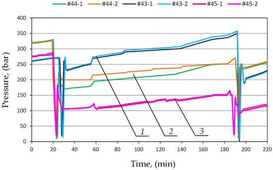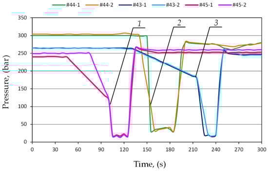 The course of pressure changes in the sub-piston space of the hydraulic stand using a prototype double block with automatic charging, where 1—section No. 45; 2—section No. 44; and 3—section No. 43.