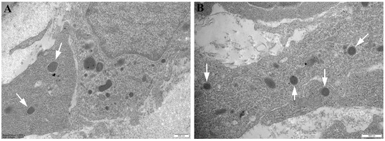 As suggested by previous studies, these microorganisms were generally detected in splenic erythrocytes/macrophages and skin macrophages/fibroblasts [9]. From a methodological point of view, this protocol adapts the standard preparative, generally applied for TEM analysis, to a new and different class of samples, skin derived from rainbow trout affected by RMS. The histological and ultrastructural evaluation of this class of samples made it possible to describe the specific pattern of RMS lesions, easily comparable to evidence already reported by several authors [20]. Furthermore, one ultrastructural study performed in RMS trout did not detect the presence of intralesional microorganisms [21]. In contrast, a recent TEM study reported the presence of intracellular bacteria characterized by ultrastructural features, similar to bacteria belonging to Rickettsiaceae and Midichloriaceae families, order Rickettsiales, as regards the shape, dimension, cell wall organization, and subcellular localization [9,12].
